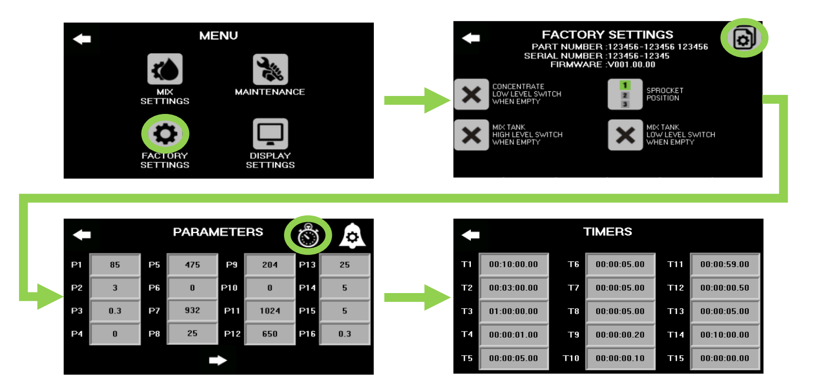 The timers can be adjusted by going to the Timers screen. From the Menu screen, go to the Factory settings screen and then to the parameters screen. From there, press the stopwatch icon to go to the Timers screen.