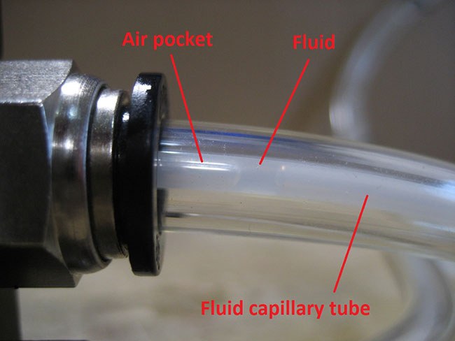 Typically, loosening this screw 1-2 turns and ensuring clear fluid (with no air bubbles) flows from the port is enough to fill the fluid chamber in each pump with fluid so it can begin pumping. Note: the screw does not need to be completely removed, and do not overtighten the screw or it can break. Be cautious on pressure fed systems as fluid in the stack is under pressure and can spray out from the bleed screw once loosened. Next, cycle the pump(s) and observe for fluid in the capillary tube. It may take several cycles for the outlet check valve housing in the pump to fill with fluid before it can be seen in the capillary tube connected to the pump. When the pump first begins to dispense fluid, there will be a mixture of fluid and air pockets in the capillary.