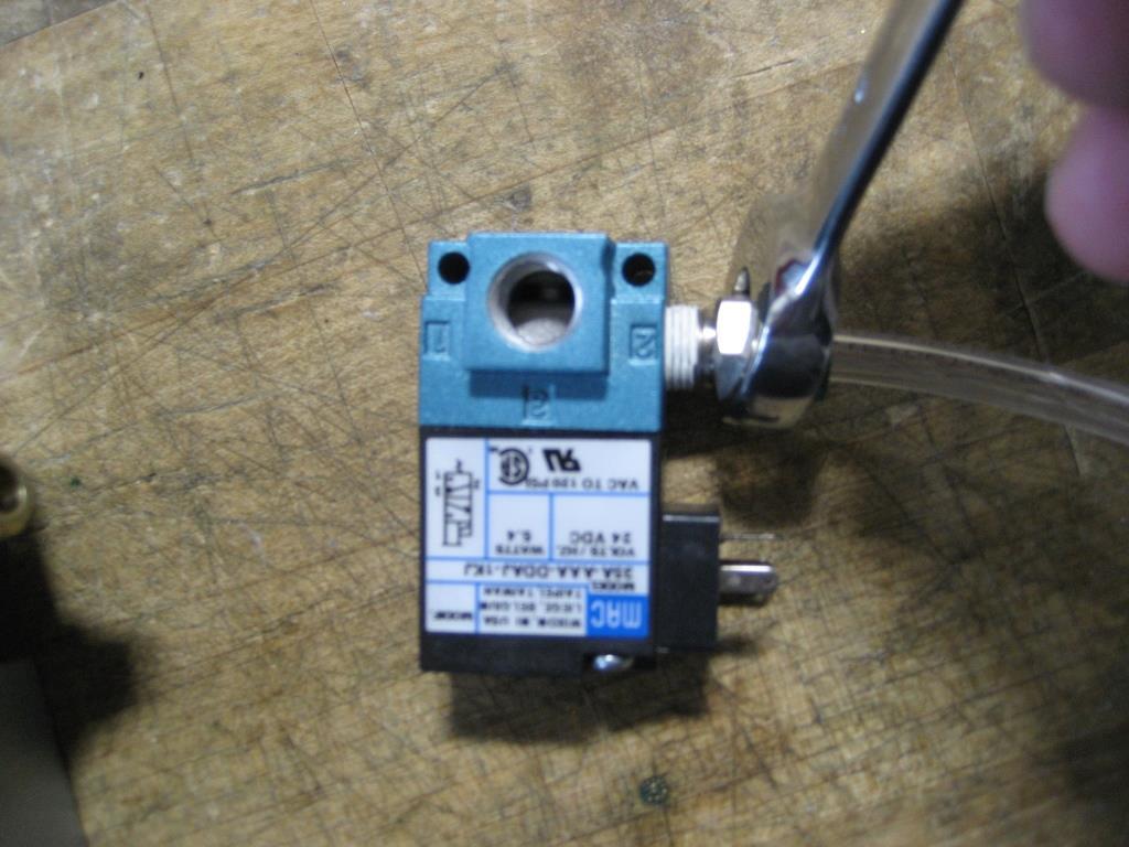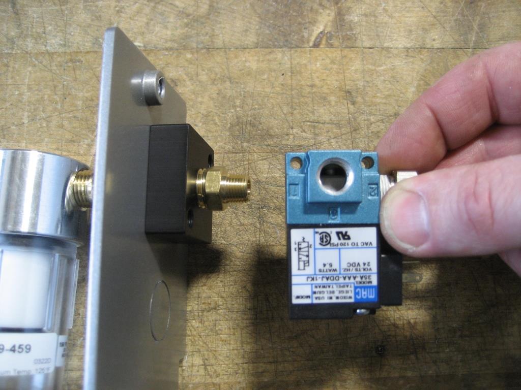 Remove any fittings from the old valve to transfer onto the replacement valve. For solenoid valves, confirm that the voltage noted on the coil matches between the old and replacement valves.