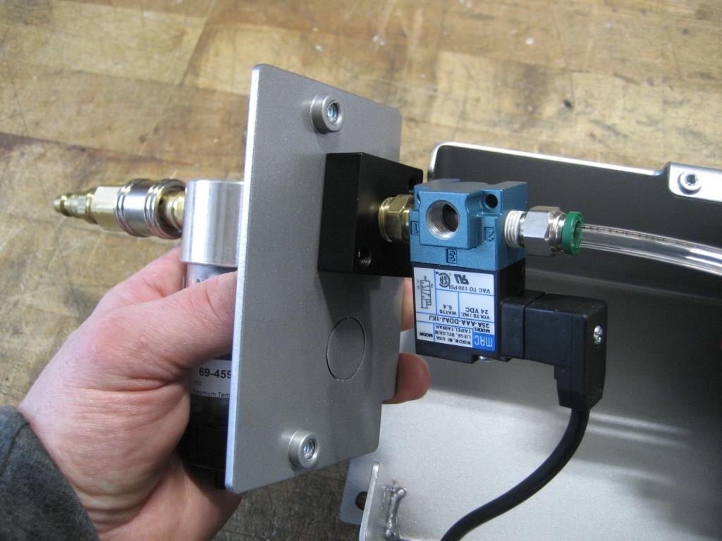 Remove the two screws attaching the side plate to the main rear enclosure and remove the sub-assembly. Remove any fittings on the valve being replaced (note, a socket and ratchet may be required to remove fittings from a valve stack with multiple valves in it.