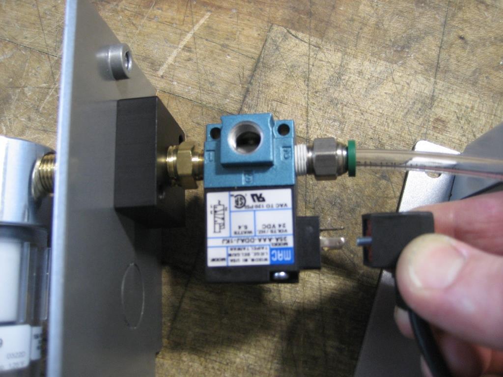 For externally mounted solenoid valves, disconnect the air line(s) from the fitting(s) on the valve and disconnect the DIN connector(s) from the valve(s).
