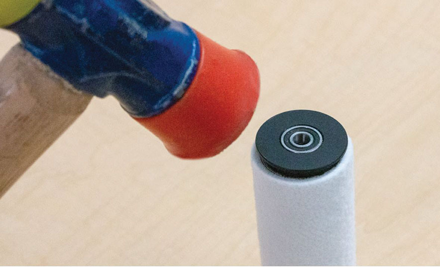 Place the exposed end of the dowel or rod onto a work bench and carefully move the roller up and down, tapping on the inside surface of the top end cap, being careful to keep the roller tilted at an angle so that the bearing is not damaged. This process can be repeated to remove the other end cap.