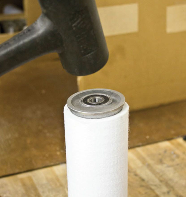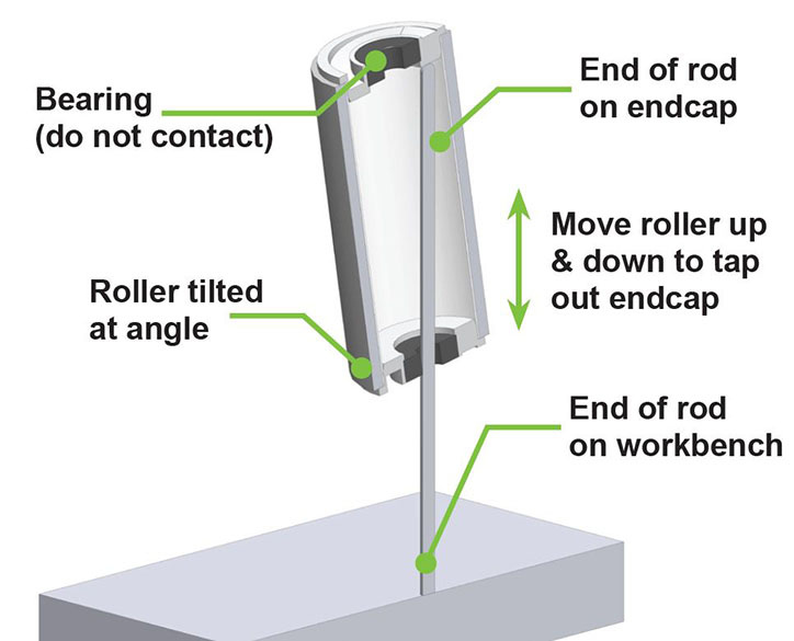 Place the exposed end of the dowel or rod onto a work bench and carefully move the roller up and down, tapping on the inside surface of the top endcap, being careful to keep the roller tilted at an angle so that the bearing is not damaged. This process can be repeated to remove the other endcap.