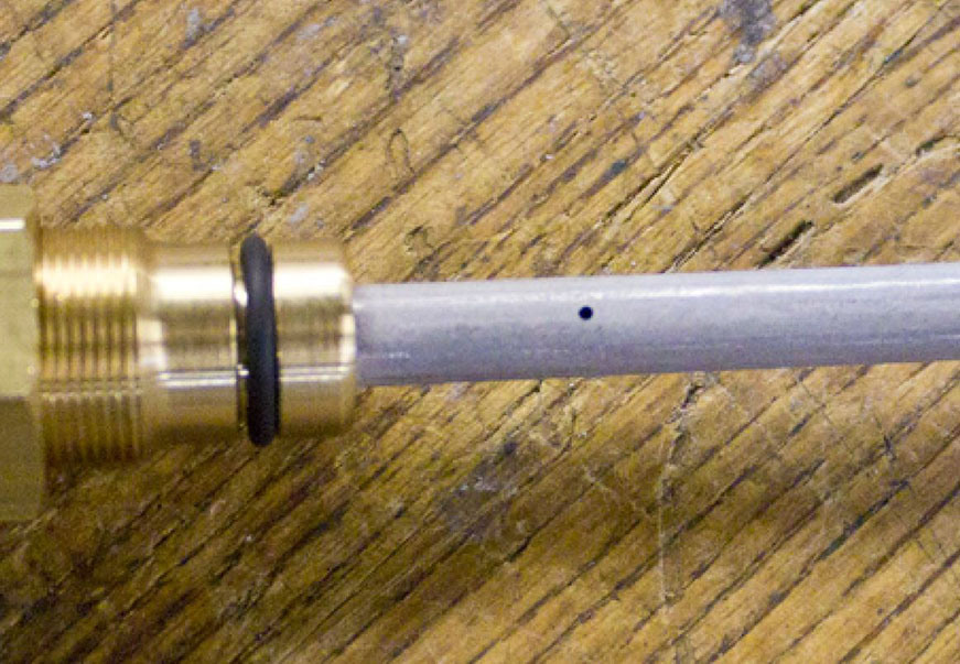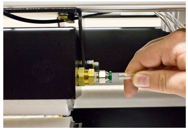 Remove the tubing from the push-to-connect fitting on the dispenser tube.