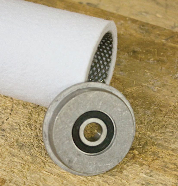 With the roller assembly removed as outlined above, remove each roller endcap by inserting a wooden or brass dowel into the roller assembly, positioning one end so that it is contacting the inside surface of the opposite roller end. Be sure the dowel is not contacting the bearing.