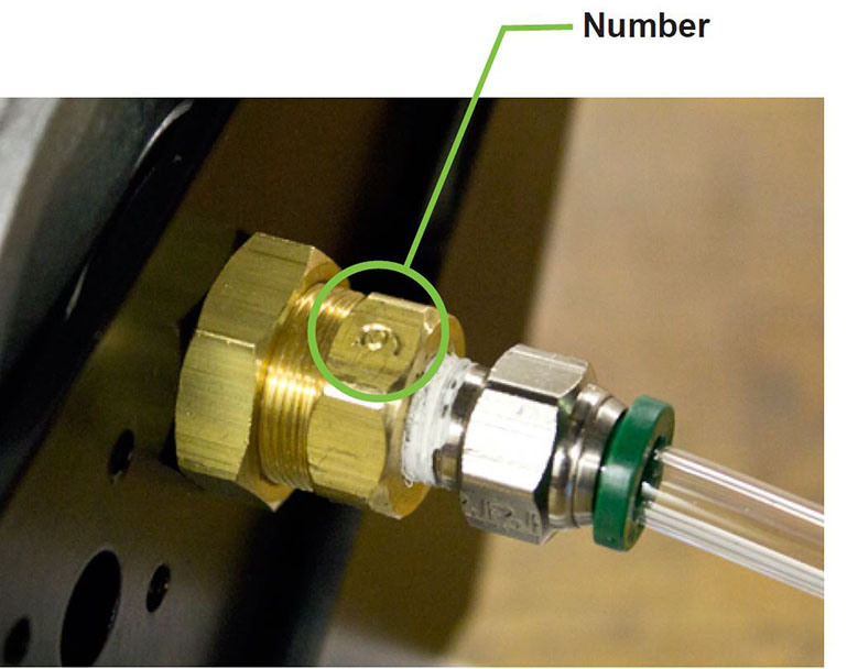Turn the dispenser tube assembly so that the stamped number is facing up and tighten the 3/4” brass hex nut.