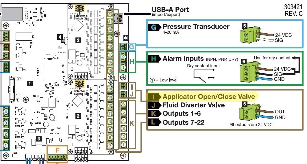 The third option is to wire only the large cylinder valve into the applicator open/close output on the SmartFlow®controller and allow the user to wire the small cylinder solenoid valve into their own controller and control the small cylinders that way.