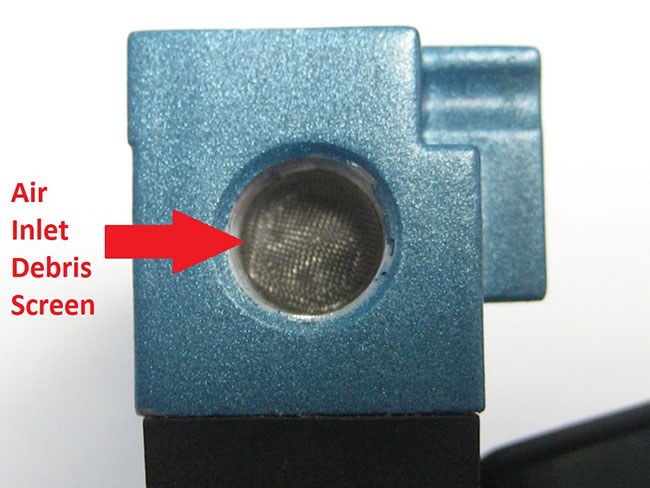The standard 12VDC, 24VDC, 24VAC, 110VAC, and 220VAC solenoid valves in 1/8” NPT and 1/4” NPT sizes are quite robust and generally operate for many years without issue. If air flow is constantly observed from the valve when no power is applied to the valve, or if no air flow is observed from the valve when power is applied, the first thing to check is that the connections on the valve are correct. There are three ports on the valve and they are labeled “1”, “2”, and “3”. Compressed air going into the valve should be connected to port 1. The outlet port on the valve is port 2. Port 3 is generally used as an exhaust port and normally will not have anything connected to it.