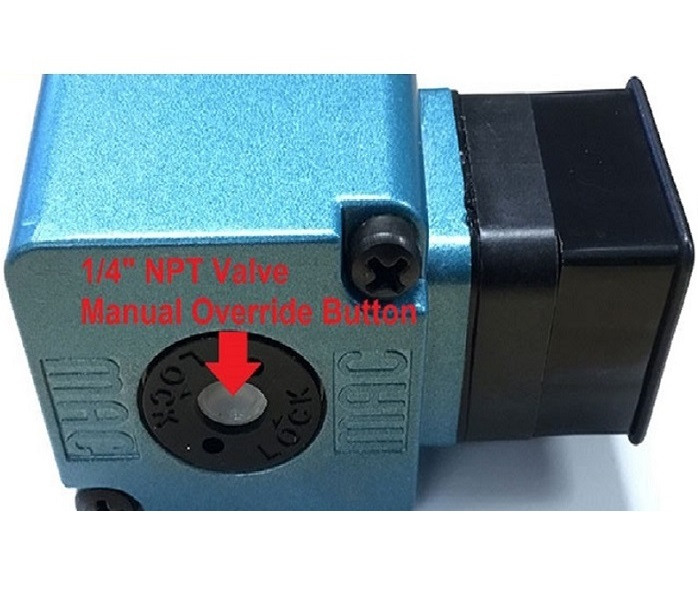 To test the valve, first remove the pressurized air from the valve. Apply appropriate power (12VDC, 24VDC, 24VAC, 110VAC, 220VAC, etc.) to the solenoid valve coil. There should be an audible click from the valve when power is applied and removed. If no audible click is heard, then there is likely an issue with the solenoid valve coil and the valve will need to be replaced.