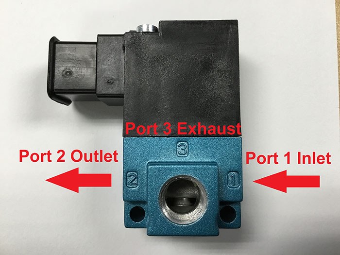 If the solenoid is operating correctly, compressed air connected to the inlet port (Port 1) will exit the outlet port (Port 2) when the solenoid is powered. If no air exits Port 2 when powered, there may be an internal issue with the valve. Also, no air should exit Port 2 or Port 3 when there is no power applied. If air does exit when there is no power applied, then there may be an internal issue with the valve. Inlet compressed air should never be connected to Port 2 or Port 3.