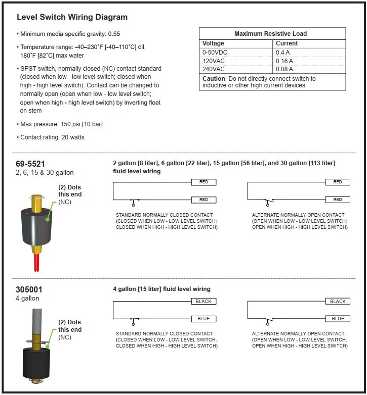 Refer to the tank level switch wiring diagram below for details.